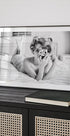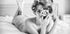 Een stijlvolle zwart-witposter met een retro-geïnspireerd portret van een vrouw met vintage haarkrullen, elegant op een bed liggend terwijl ze een klassieke camera vasthoudt. Met een mix van sensualiteit, nostalgie en artistieke expressie viert de fotografie vrouwelijke aantrekkingskracht en tijdloze glamour.