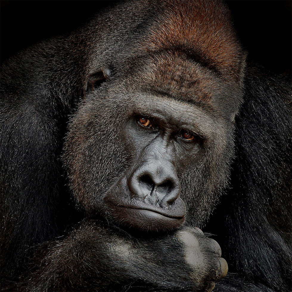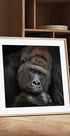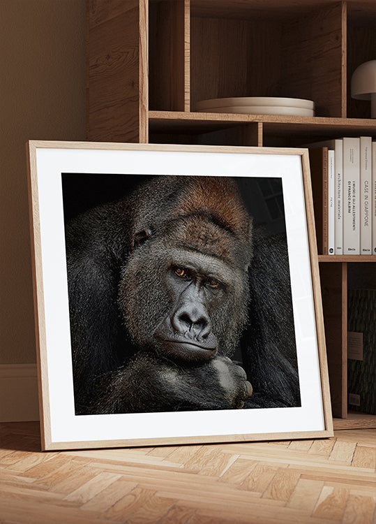 Een intense, rustige portretposter van een majestueuze zilverruggorilla, vastgelegd in een moment van stille contemplatie. De diepe, wijze ogen ontmoeten de jouwe en creëren tegelijkertijd aanwezigheid, kwetsbaarheid en kracht. De schaduwen benadrukken de onderscheidende kenmerken en geven het motief een tijdloze, sculpturale rust. Door Antje Wenner-Braun. De titel is ÉÉN MOMENT IN CONTACT.