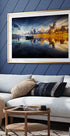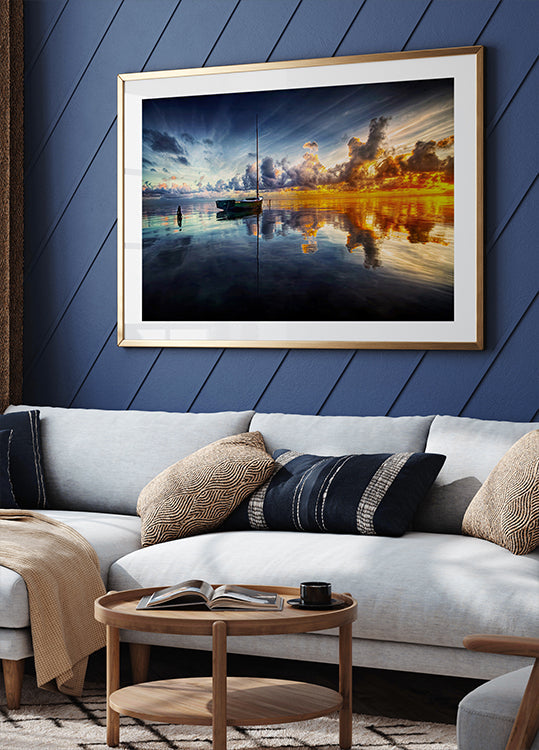Dit adembenemende zeegezicht legt een eenzame zeilboot vast die op kalm water rust onder een dramatische zonsondergang. De reflecties van gouden wolken rimpelen over het wateroppervlak en combineren rust met grandeur, waardoor een tijdloos stukje maritieme kunst ontstaat dat vrede, rust en natuurlijke schoonheid uitstraalt.