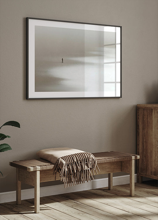 Een eenzame persoon staat stil op een mistig strand, omgeven door zachte schaduwen. Een dromerig en minimalistisch werk dat rust, bezinning en de kracht van stilte uitstraalt.