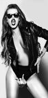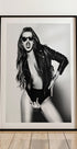 Een gewaagd en gedurfd zwart-wit portret van een vrouw in een leren jasje en zonnebril dat vertrouwen en houding uitstraalt. Dit opvallende, op mode geïnspireerde kunstwerk combineert sensualiteit, rebellie en glamour en is perfect voor moderne interieurs, moderuimtes of als hedendaags kunststatement aan de muur.
