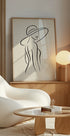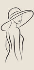 Een sierlijke, minimalistische lijntekening van een vrouw met een breedgerande hoed, vastgelegd in een elegante zijwaartse houding. De eenvoudige zwarte lijnen op een zachtbeige achtergrond creëren een moeiteloos chique en tijdloze mode-illustratie — perfect voor moderne interieurs en stijlvolle fotowanden.