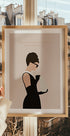 Een minimalistische en stijlvolle illustratie van een vrouw in een klassieke zwarte jurk, geïnspireerd door tijdloze mode en elegantie. Het citaat “Elegantie is de enige schoonheid die nooit vervaagt” voegt verfijning toe, waardoor dit kunstwerk perfect is voor modeliefhebbers, elegante huizen en moderne wanddecoraties.