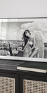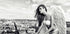 Een dramatisch zwart-wit kunstwerk van een vrouw met engelenvleugels die uitkijkt over de skyline van een uitgestrekte stad. Dit opvallende beeld combineert fantasie en stedelijk realisme en roept kracht, schoonheid en mysterie op: een engelachtige aanwezigheid tegen de skyline van de moderne metropool.