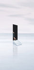 Een surrealistisch conceptueel kunstwerk van een persoon die door een donkere deur over kalm, reflecterend water stapt. De minimalistische opstelling, met een trap die naar het niets leidt, roept thema's op als ontsnapping, vertrek en een nieuw begin. De scène combineert dromerig surrealisme met op de midcentury geïnspireerde esthetiek.