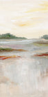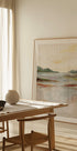 Een zacht en suggestief landschapsschilderij met rustige penseelstreken en gedempte kleuren. Dit abstracte waterlandschapsbeeld verenigt aarde, water en lucht in een vredige horizon die gevoelens van kalmte en contemplatie oproept. Een perfect kunstwerk om een rustgevende en op de natuur geïnspireerde sfeer aan elke kamer toe te voegen.