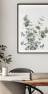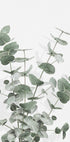 Een minimalistisch botanisch kunstwerk met eucalyptusbladeren tegen een strakke witte achtergrond. De zachte schaduwen en natuurlijke tinten groen creëren een fris en rustgevend kunstwerk aan de muur, perfect voor moderne interieurs, Scandinavisch design of op de natuur geïnspireerde ruimtes.