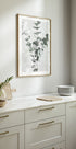 Een rustige en minimalistische poster met eucalyptustakken waarvan de ronde, matte bladeren elkaar overlappen in een lichte dubbele belichting. De zachte groene tinten zweven tegen een lichte, bijna gewichtloze achtergrond en creëren lucht, balans en Scandinavische eenvoud. Perfect op zichzelf of als onderdeel van een harmonieuze fotowand. Ideaal in de woonkamer, slaapkamer of kantoor.