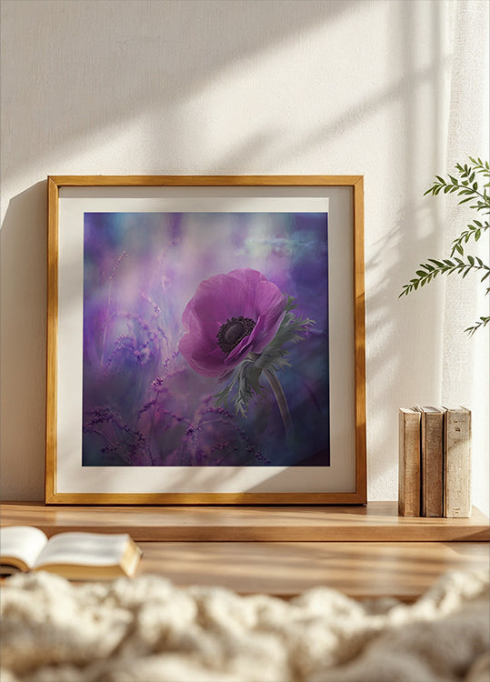 Ecstasy van Natalia Simongulashvili (NATALIORION) legt een dromerig botanisch moment vast: zachtpaarse bloemen en fijne grassprietjes verschijnen in een fluweelachtig licht, omlijst door een discreet vignet. Een rustige bloemenscène die onderdompeling, poëzie en een vleugje tuinmagie in de kamer creëert. Creëert een zwevende, poëtische rust in huis.