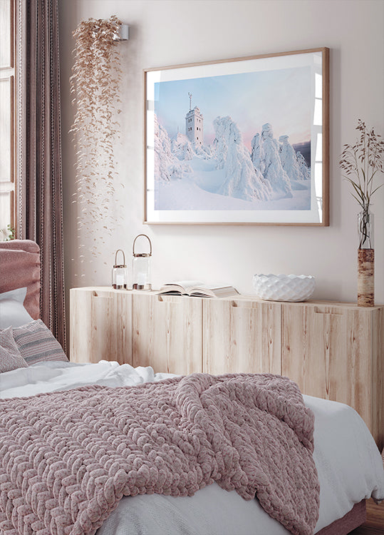 Fichtelberg in winterkledij: Een met vorst bedekte uitkijktoren torent boven de met sneeuw bedekte bomen van het Ertsgebergte uit, terwijl de horizon verdwijnt in kille mist. Het contrast tussen ijzige structuren en zachte sneeuw zorgt tegelijkertijd voor rust en drama. Het motief is gemaakt door de fotograaf Christoph Schaarschmidt. Een sfeervol wintermotief uit het Duitse Erzgebirge.