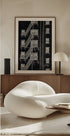 Fire Escape Negative Image af Janel Bragg fanger byens puls i en dramatisk, monokrom komposition. En ydre trappes skarpe linjer og skygger tegner grafiske mønstre mod facadens vinduer og stål. Et moderne, urban motiv med industriel poesi, perfekt til at skabe kant og rytme i rummet. Inspireret af storbyens geometri og tidløs minimalisme.