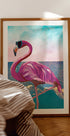 Een speelse en kleurrijke kunstposter met een roze flamingo met een chique hartvormige zonnebril aan zee. Met sterke tinten roze, blauw en magenta straalt deze tropische illustratie vakantievibes en zomerplezier uit – perfect voor strandliefhebbers.