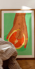 Grapefruit Touch-poster is een opvallend en provocerend modern kunstwerk dat thema's als sensualiteit, kracht en speelse rebellie onderzoekt. Het toont een hand met een diepbruine huid, versierd met gouden ringen en opvallende roodgeverfde nagels, die een gehalveerde grapefruit omlijst in een symbolisch en suggestief gebaar. Op een frisse, gestructureerde groene achtergrond creëren de warme tonen van de hand en het fruit een boeiend contrast. Dit gedurfde stuk is perfect voor hedendaagse ruimtes die lichaamspositiviteit, zelfexpressie en onvoorwaardelijk vertrouwen omarmen.