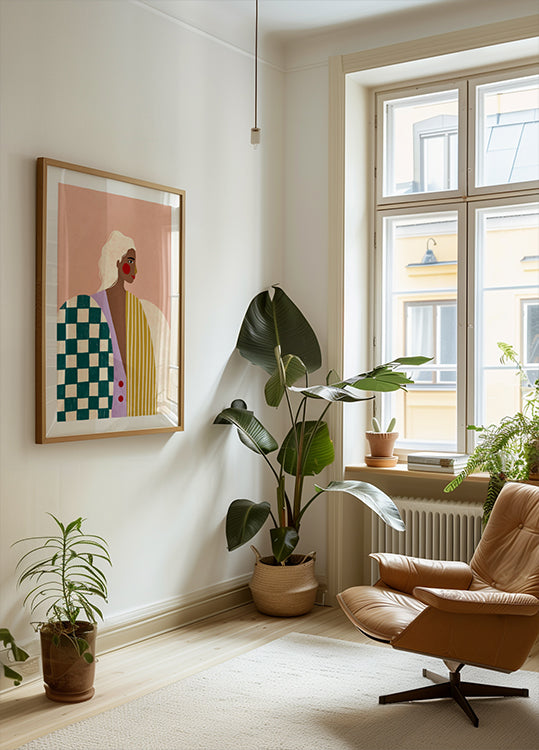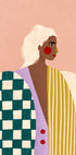Dit abstracte kunstwerk toont een gestileerd portret van een vrouw in een opvallende geometrische blouse met levendige kleuren. Het werk benadrukt modern design, minimalisme en artistieke expressie met expressieve vormen tegen een gedempte achtergrond – perfect voor liefhebbers van hedendaagse kunst.