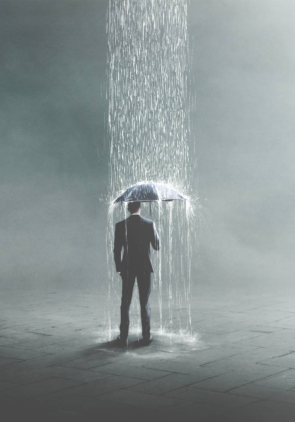 Een surrealistisch kunstwerk van een man in pak met paraplu, de regen valt alleen op hem. De droge achtergrond benadrukt het gevoel van eenzaamheid en psychologische druk. Een sterke visuele metafoor in kalme grijstinten.