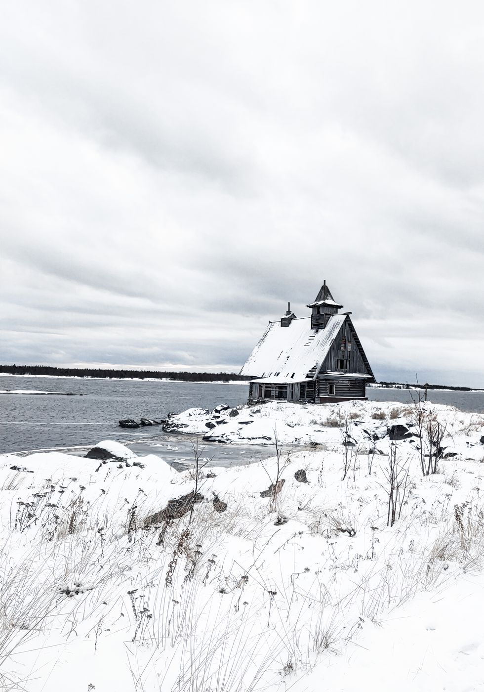 Een suggestieve foto van een verlaten houten hut die alleen staat aan een bevroren meer, omgeven door een rustig, besneeuwd landschap. De gedempte kleuren en de open lucht creëren een gevoel van eenzaamheid, mysterie en de rauwe schoonheid van de ongerepte wildernis van de natuur. Perfect voor liefhebbers van Scandinavische esthetiek, minimalisme en winterlandschappen.