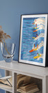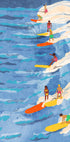 Een levendige en kleurrijke illustratie van surfers die op longboards over de golven rijden en de zorgeloze energie van de zomer en het zeeleven vastleggen. Met krachtige kleuren en dynamische beweging viert dit kledingstuk watersport, reizen en vrije tijd en past het perfect in kustgeïnspireerde of retro surfinterieurs.