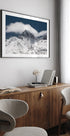 Een rustig winterlandschap ontvouwt zich in heldere, blauwachtige tinten: majestueuze met sneeuw bedekte toppen steken boven mistige valleien uit, terwijl zachte wolken langs de hemel drijven. De schone, koele sfeer nodigt uit tot contemplatie en rust. Een poëtische kijk op de kracht en stilte van de bergen, gemaakt door Xiaoyang Wang. Ideaal als rustig middelpunt in de woonkamer.
