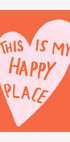 Dit kunstwerk toont een handgetekend roze hart op een oranje achtergrond met de woorden "Dit is mijn gelukkige plek." Het roept positiviteit en warmte op, perfect voor woondecoratie of motiverende ruimtes.