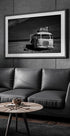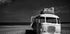 Een suggestieve zwart-witfoto van een verlaten vintage bus die is gestrand op een zandstrand. Met versleten koffers opgestapeld op het dak en de zee op de achtergrond drukt het beeld verlaten reizen, verval en het verstrijken van de tijd uit.