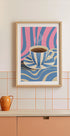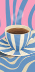 Een speelse en levendige illustratie van een dampende kop koffie in een gestreept blauw-wit kopje met schotel. De opvallende roze en blauwe achtergrond zorgt voor een leuke, retro-geïnspireerde sfeer - perfect voor keukens, cafés of iedereen die houdt van een stijlvol koffiemoment aan de muur.