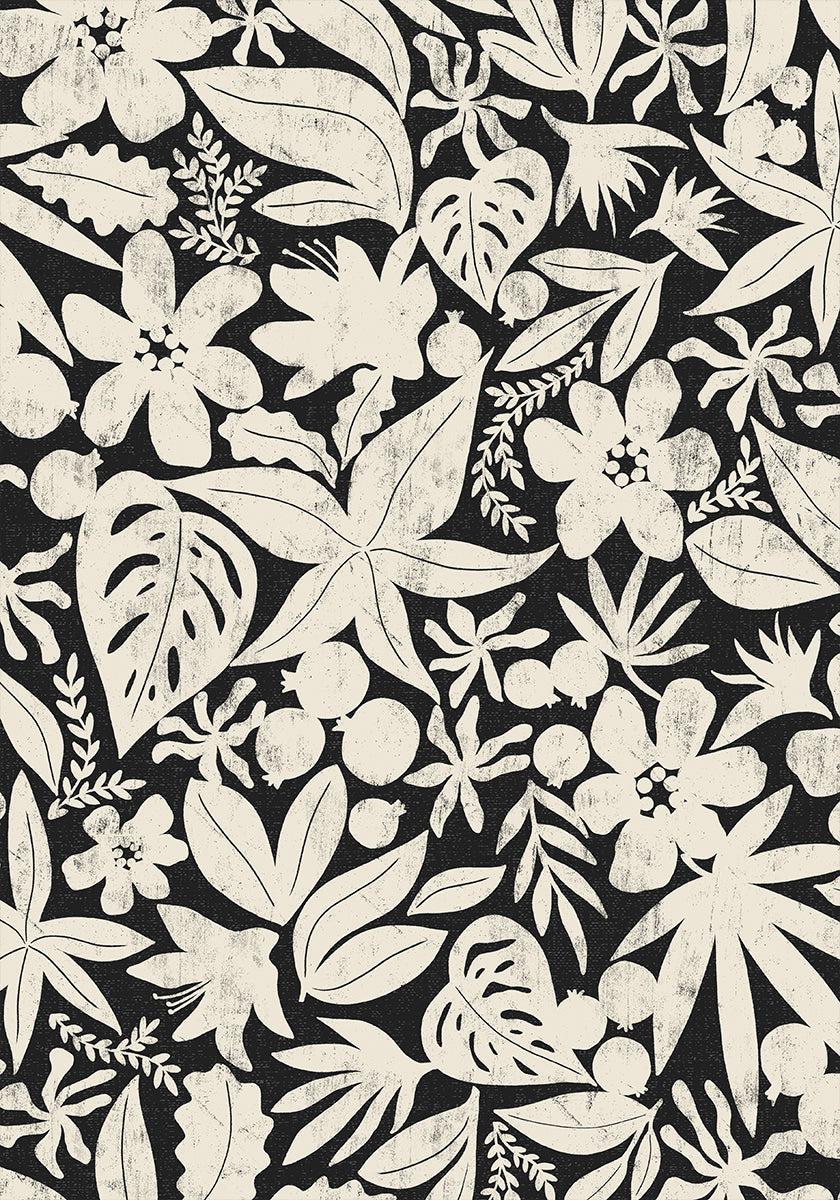 Cosy van Dana Ďuričeková combineert modern minimalisme met de poëzie van de natuur: een handgetekend, zwart-wit motief met grafische silhouetten van bladeren, bloemen en vruchten. De sterke contrasten en fijne texturen creëren rust en aanwezigheid die perfect zijn voor zowel Scandinavische, tropische als artistieke ruimtes. Een stijlvol statement voor de hal, woonkamer of kantoor.