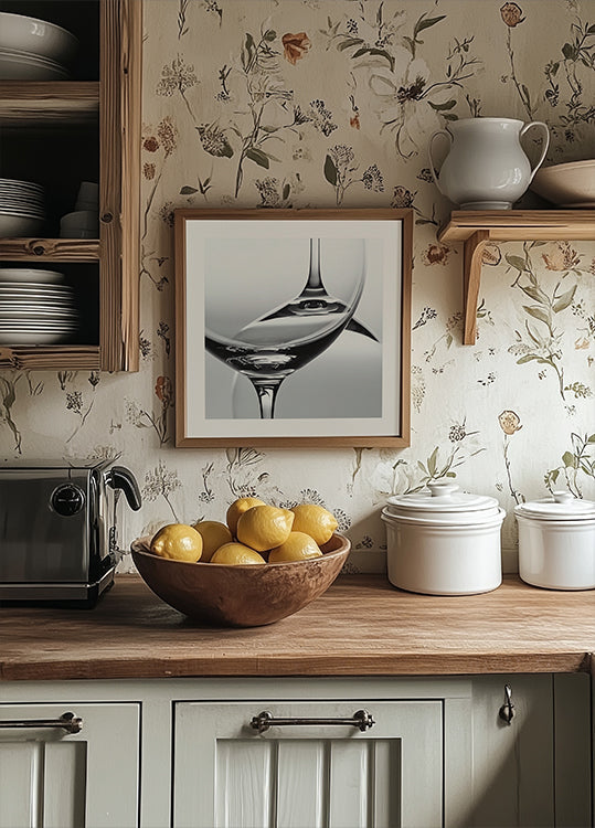 Twee elegante wijnglazen in zwart-wit vormen een grafisch stilleven, waarbij zachte rondingen en scherpe lijnen elkaar spiegelen. Eén glas staat ondersteboven, waardoor spanning, ritme en perfecte symmetrie ontstaat. Een minimalistische, tijdloze compositie voor de keuken, bar of woonkamer met gevoel voor rust en esthetiek. Een discreet statement aan de muur.