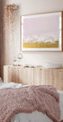 Gouden bergtoppen rijzen op in een grafisch, helder winterlandschap, waar sneeuw en vorst scherpe lijnen trekken tegen de warme gloed. Abstracte vormen vormen ritmische lagen van heuvels en pieken die tegelijkertijd rust en drama creëren. Een elegant, Scandinavisch motief van Gemma Bardot dat kou, glans en stille grandeur vangt.