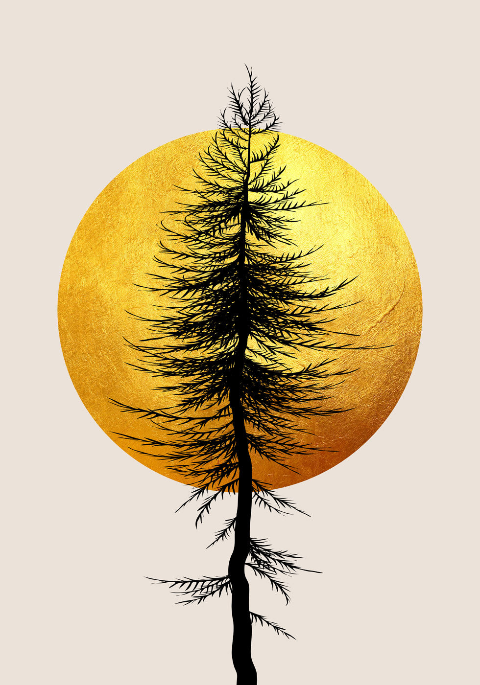 Een opvallende minimalistische compositie met een zwarte boom afgetekend tegen een schitterende gouden zon. De gestructureerde gouden achtergrond creëert een mooi contrast met de delicate takken, wat een moderne en op de natuur geïnspireerde esthetiek geeft. Perfect voor liefhebbers van elegante eenvoud, Scandinavisch decor en modern design.