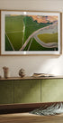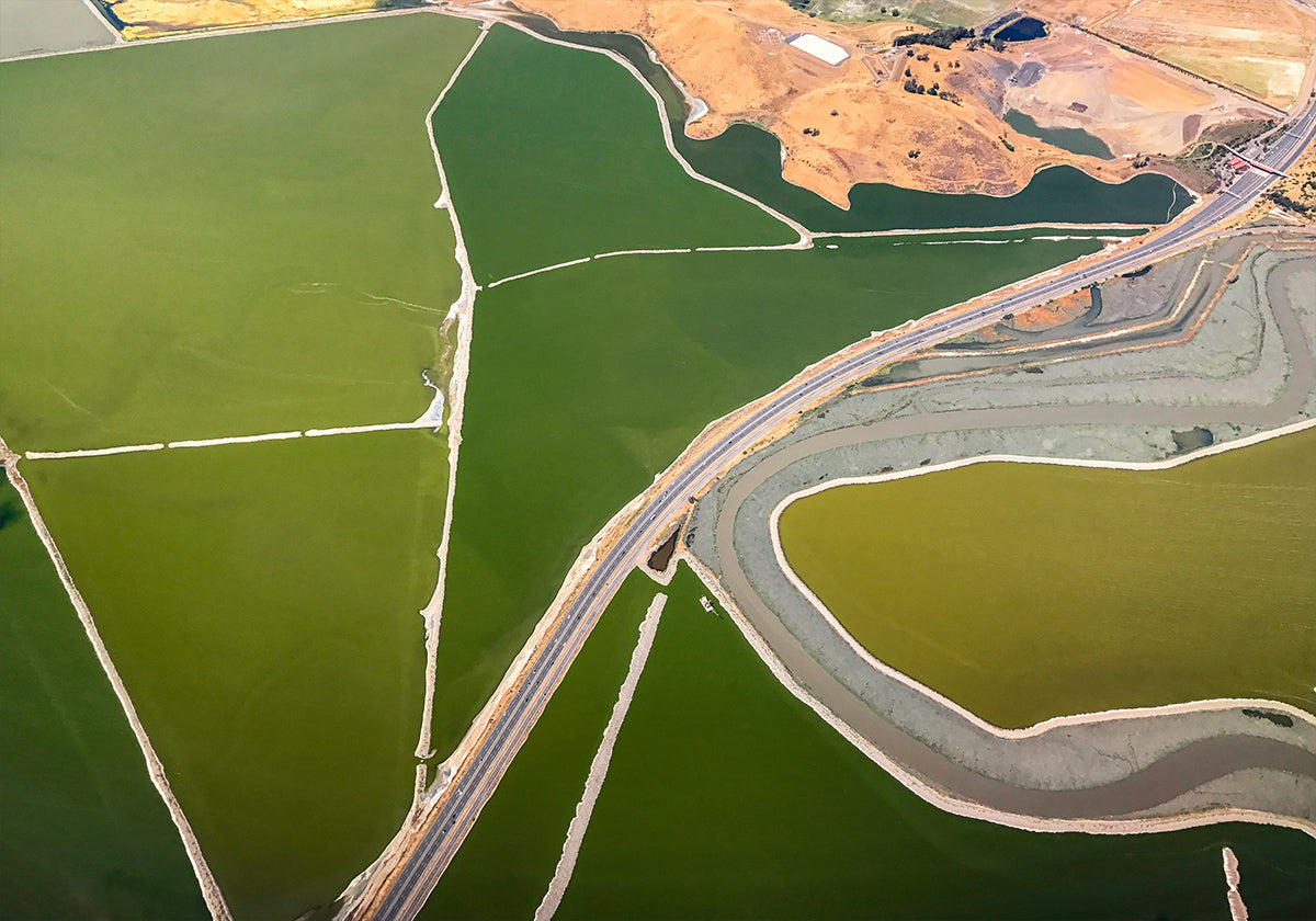 Een prachtige luchtfoto van het landschap van de Baai van San Francisco, waar kronkelende wegen, beken en groene velden duidelijke geometrische patronen vormen. Dit kunstwerk, van bovenaf vastgelegd, benadrukt de schoonheid van de grenzen van de natuur en de door de mens gemaakte grenzen, waardoor het moderne fotografische kunst aan de muur is.