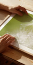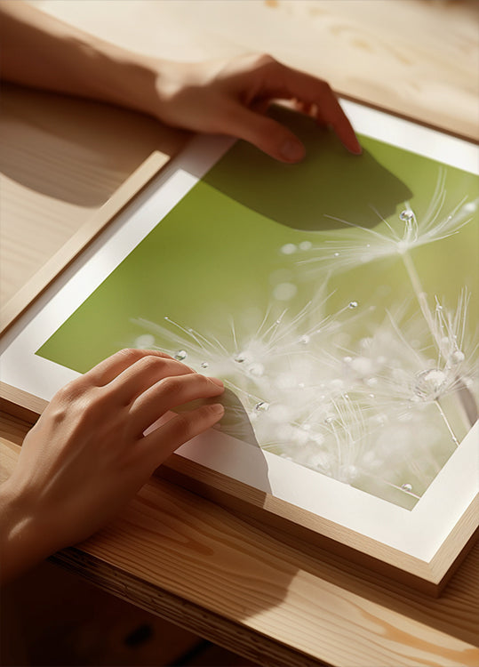 Green van Hilde Ghesquiere legt een poëtisch macromoment vast: zachte groentinten, fijne veerstructuren en delicate waterdruppels die als parels schitteren in het licht. Een minimalistisch, rustgevend motief dat uitnodigt tot rust en contemplatie en de rustige poëzie van de natuur in huis brengt. Perfect voor een Scandinavische inrichting.