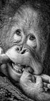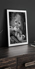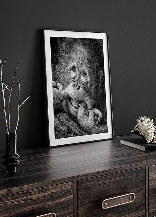 Een humoristisch en hartverwarmend zwart-wit portret van een jonge primaat met een speelse uitdrukking. De foto straalt vreugde, onschuld en een brutale glimlach uit en voegt warmte en humor toe aan elke muur.