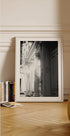 Een stijlvolle zwart-witfoto van een Gucci-winkel, met de nadruk op de elegante gevel en het iconische uithangbord. Deze print weerspiegelt de geest van Italiaanse luxe en tijdloze mode en wordt een verfijnde keuze voor muurkunst voor interieurs geïnspireerd door design, cultuur en de modewereld.