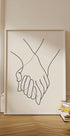 Een minimalistische, monochrome lijntekening van twee handen die elkaar in een zachte, stevige greep ontmoeten. De strakke, zwarte lijnen op een witte achtergrond benadrukken liefde, vertrouwen en rust, terwijl de negatieve ruimte voor balans zorgt. Een poëtisch en stijlvol motief van Pictufy Studio II voor de woonkamer, slaapkamer en hal. Een discreet symbool van aanwezigheid, romantiek en gemeenschap.