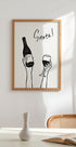Handen die een wijnfles en een wijnglas vasthouden met de tekst "Cheers!" in Franse affiche