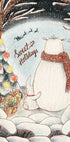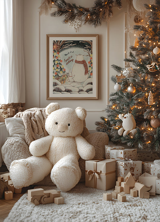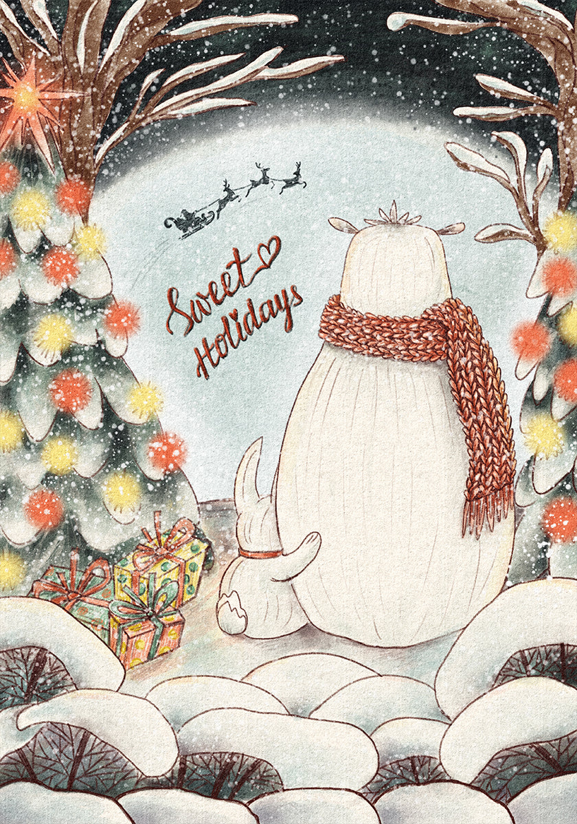 Met Heart of the Forest laat Olena Kovalova ons een rustige open plek in het bos betreden, waar een beer en een konijn elkaar ontmoeten tussen sneeuwvlokken en sparren. Vintage-geïnspireerde kersttinten in rood, groen en blauwgroen voegen warmte toe aan het ijzige tafereel en brengen avonturen uit de kindertijd en winterpret tot leven. Een zoet eerbetoon aan de rust van Kerstmis midden in de natuur.