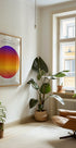 Een modern, minimalistisch kunstwerk met een schitterend cirkelvormig verloop, geïnspireerd op de kleuren van de zonsondergang. Met een mix van dieppaarse, gloeiende oranje en gouden tinten creëert dit abstracte ontwerp een harmonieus brandpunt, perfect voor moderne interieurs en creatieve ruimtes.