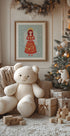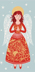 Een etherische roodharige engel van kunstenaar Nic Squirrell staat in stil gebed onder een met sterren bezaaide middernachthemel, met een stralende halo en ontvouwde zachte vleugels. Een karmozijnrode jurk in folkstijl bloeit met bloemmotieven, omlijst door de charme van vintage verhalenboeken en fonkelende sterren, waardoor elke ruimte stilte, hoop en vakantiewonder krijgt.
