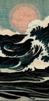 Een dramatisch Japans geïnspireerd golfkunstwerk met een getextureerde vintage-stijl. De krachtige oceaangolven stijgen op onder een gedempte zon, die traditionele kunst verenigt met moderne Japanse esthetiek. Perfect voor liefhebbers van zeegezichten en traditionele golfschilderijen.