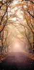Een dromerig herfststeegje geflankeerd door hoge eikenbomen, waar de gouden bladeren door de zachte mist schijnen. De mistige atmosfeer creëert een gevoel van kalmte en mysterie en leidt de blik over de eindeloze weg. Een fantastische seizoensprint die herfstlandschappen vastlegt.