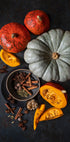 Een rustiek herfststilleven met pompoen, kaneelstokjes, nootmuskaat, kardemom en steranijs. Deze warme en gezellige compositie vangt de essentie van de herfstoogst en de smaken van het seizoen, perfect voor keukens en feestelijke kerstversieringen.