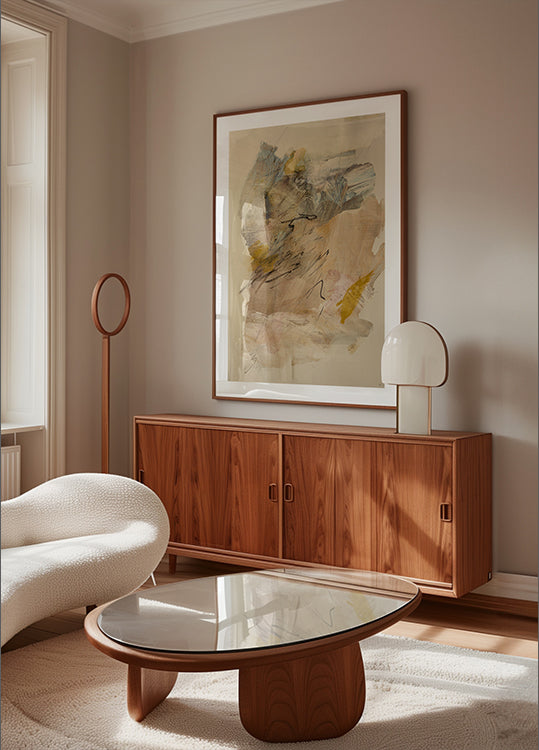 Hot July van Gemma Bardot – een abstracte compositie met warme gele tinten, beige tinten en vrije penseelstreken. Organische lijnen en speelse krabbels zorgen voor beweging en zomerse energie, terwijl neutrale velden voor rust en balans zorgen. Een moderne statementposter die de kamer een zonnige lichtheid geeft. Perfect voor de woonkamer, kantoor en creatieve hoekjes.