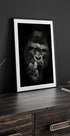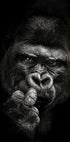 Een opvallend zwart-witportret van een gorilla, vastgelegd in een moment van rauwe intensiteit. De diepe schaduwen en fijne details benadrukken de kracht en de bedachtzame blik van het dier, wat het kunstwerk een dramatische, bijna menselijke uitdrukking geeft. Perfect voor moderne interieurs en galeriewanden die op zoek zijn naar sterke, expressieve statement-stukken.