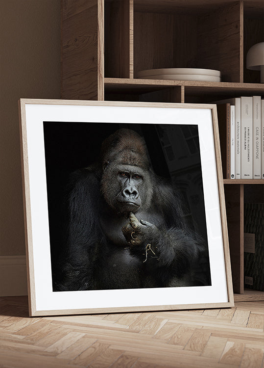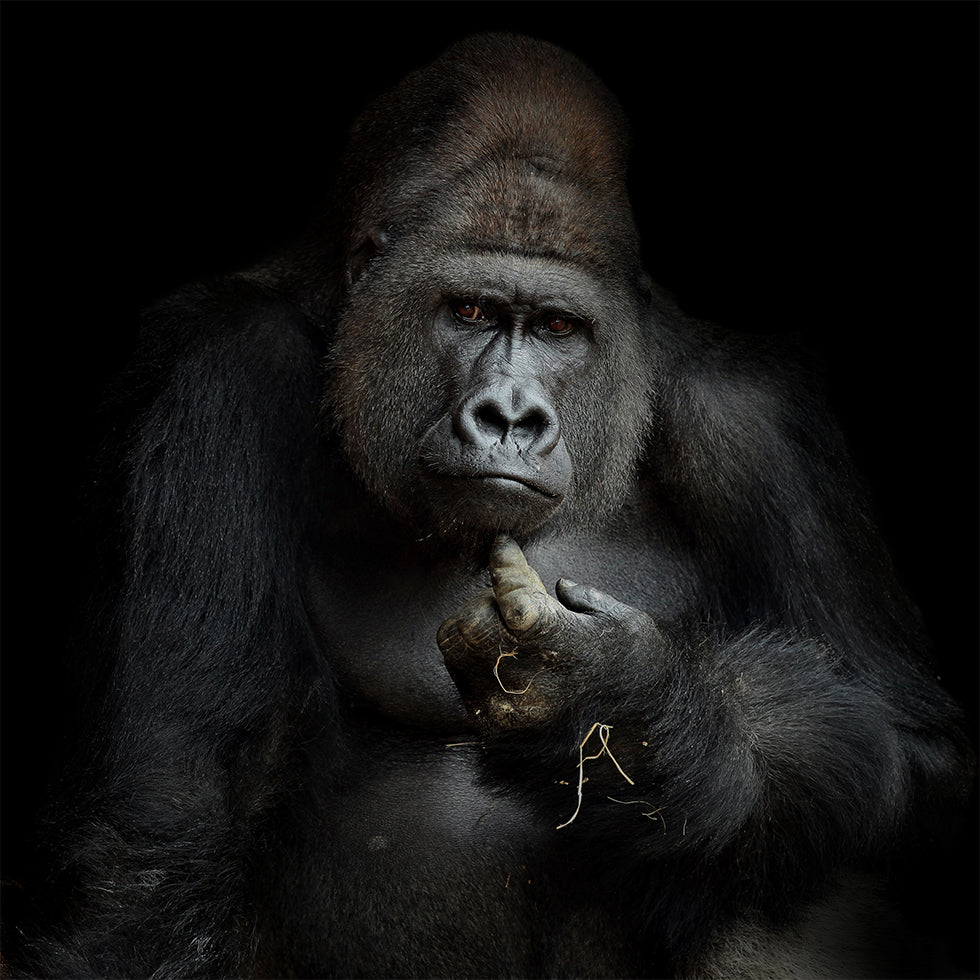 Een dramatisch, rustig portret van een zilverrug, gehuld in diepe schaduw tegen een zwarte achtergrond. De blik is intens en nadenkend, als een stil gesprek over kracht, kwetsbaarheid en wijsheid. Antje Wenner-Braun legt het magische moment vast waarop het gezicht van de primaat verandert in pure, moderne poëzie. Een eerbetoon aan de waardigheid en stille kracht van de gorilla.