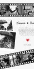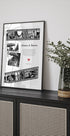 Een moderne en romantische fotocollage voor koppels. De lay-out combineert een filmstrip met schuine polaroid-geïnspireerde afbeeldingen, een zacht hartdetail en elegante typografie. Personaliseer met je eigen foto's, namen en een speciale datum om een tijdloze herinnering te creëren voor een jubileum, bruiloft of Valentijnsdag. De pure zwart-wituitdrukking geeft een klassieke, stijlvolle uitstraling, waarbij herinneringen centraal staan.