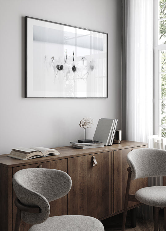 De sierlijke dans van twee rode kraanvogels zweeft over een met sneeuw bedekt landschap, vastgelegd in een opvallende, kalligrafische uitdrukking door Larry Deng APA. De zachte, inktachtige streken en de minimalistische ruimte creëren rust, beweging en poëzie – zoals winterwind op papier – een rustig eerbetoon aan de Japanse elegantie en het ritme van de natuur. Een poëtische look voor uw ruimte.