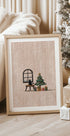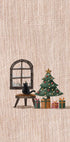 Een charmant, op borduurwerk geïnspireerd kunstwerk met een zwarte kat die bij een raam zit en naar de sneeuw kijkt. Een versierde kerstboom met cadeautjes zorgt voor gezelligheid en kerstsfeer, perfect als kerstdecor voor in huis.