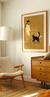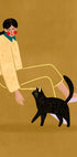 Een moderne illustratie van een vrouw en haar zwarte kat, ontworpen in warme neutrale tinten met een minimalistische maar gestileerde esthetiek. Dit kunstwerk straalt gezelligheid, gemeenschap en liefde uit – perfect voor huizen met kattenliefhebbers.