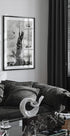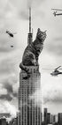 Een surrealistisch en humoristisch kunstwerk van een gigantische kat bovenop het Empire State Building, omringd door helikopters in een op King Kong geïnspireerde parodie. Dit zwart-witte stadsgezicht is perfect voor kattenliefhebbers en fans van leuke stadsdecoratie.