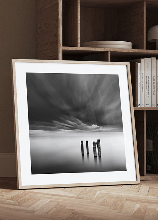 Time after Time van George Digalakis legt een poëtisch zwart-wit zeegezicht vast: versleten palen staan als ritmische tekens in het stille, zijdezachte water, terwijl lage wolken langs de horizon drijven. De lange belichtingstijd creëert een kalme, tijdloze sfeer van melancholiek, winderig en stil na een storm. Een meditatief gevoel van oneindigheid.
